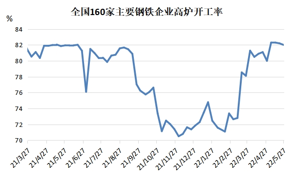 據(jù)蘭格鋼鐵網(wǎng)統(tǒng)計(jì)數(shù)據(jù)顯示,截止到5月27日全國(guó)160家主要鋼鐵企業(yè)高爐開工率為82.00%,較4月底上漲2個(gè)百分點(diǎn)。目前以唐山為代表的的北方鋼廠減產(chǎn)意愿不強(qiáng),以華東為代表的的南方鋼廠梅雨季節(jié)將至,更傾向暫時(shí)減產(chǎn)以緩解庫(kù)存壓力。另外,根據(jù)中鋼協(xié)統(tǒng)計(jì)重點(diǎn)企業(yè)生產(chǎn)情況來(lái)看,截止到5月中旬,累計(jì)日產(chǎn)粗鋼230.12萬(wàn)噸,環(huán)比增長(zhǎng)1.26%。