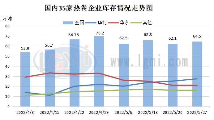 鋼廠熱卷庫(kù)存高位情況有所緩解。據(jù)蘭格鋼鐵云商平臺(tái)監(jiān)測(cè)數(shù)據(jù)顯示,截止本月底,全國(guó)35家樣本鋼企熱卷廠內(nèi)庫(kù)存為64.50萬(wàn)噸,較4月底減少5.7萬(wàn)噸或8.12%。