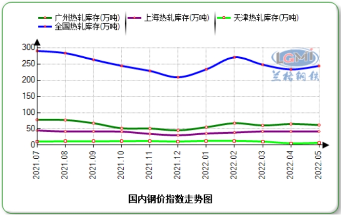 5月份熱卷庫(kù)存據(jù)蘭格鋼結(jié)束去庫(kù)行情,庫(kù)存表現(xiàn)為累庫(kù)狀態(tài)。據(jù)蘭格鋼鐵網(wǎng)監(jiān)測(cè)數(shù)據(jù)顯示,本月底國(guó)內(nèi)熱軋卷板社會(huì)庫(kù)存量約為243.71萬(wàn)噸,環(huán)比增加10.72萬(wàn)噸。重點(diǎn)城市庫(kù)存整體表現(xiàn)不一,華東、華南庫(kù)存小幅下降,華北區(qū)域天津社會(huì)庫(kù)存有所增加。具體來(lái)看,廣州地區(qū)熱卷社會(huì)庫(kù)存量約為61.91萬(wàn)噸,環(huán)比下降3.05萬(wàn)噸;上海熱卷社會(huì)庫(kù)存量環(huán)比減少0.21萬(wàn)噸至41.84萬(wàn)噸;天津熱卷社會(huì)庫(kù)存量約為7.20萬(wàn)噸,環(huán)比增加1.58萬(wàn)噸。
