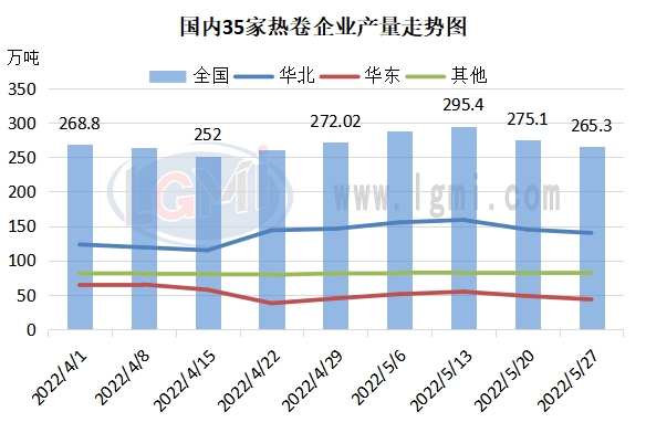 熱卷產(chǎn)量小幅下降。截止到5月27日,國(guó)內(nèi)35家熱劇企業(yè)產(chǎn)量為265.3萬(wàn)噸,較4月底下降6.72萬(wàn)噸或2.47%,但仍處于相對(duì)高位。受熱卷需求以及鋼廠利潤(rùn)壓力等方面影響,部分鋼廠熱卷軋線有所檢修利空產(chǎn)量相比上月底小幅下降。