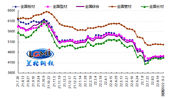 2022年第35周(2022.8.22-8.26)蘭格鋼鐵全國絕對(duì)價(jià)格指數(shù)為4386元,較上周上升0.9%,較去年同期下降23.5%。其中,蘭格鋼鐵長材絕對(duì)價(jià)格指數(shù)為4300元,較上周上升0.4%,較去年同期下降19.9%;蘭格鋼鐵型材絕對(duì)價(jià)格指數(shù)為4405元,較上周上升0.4%,較去年同期下降22.6%;蘭格鋼鐵板材絕對(duì)價(jià)格指數(shù)為4357元,較上周上升1.7%,較去年同期下降27.4%;蘭格鋼鐵管材絕對(duì)價(jià)格指數(shù)為4982元,較上周下降0.1%,較去年同期下降19.9%。