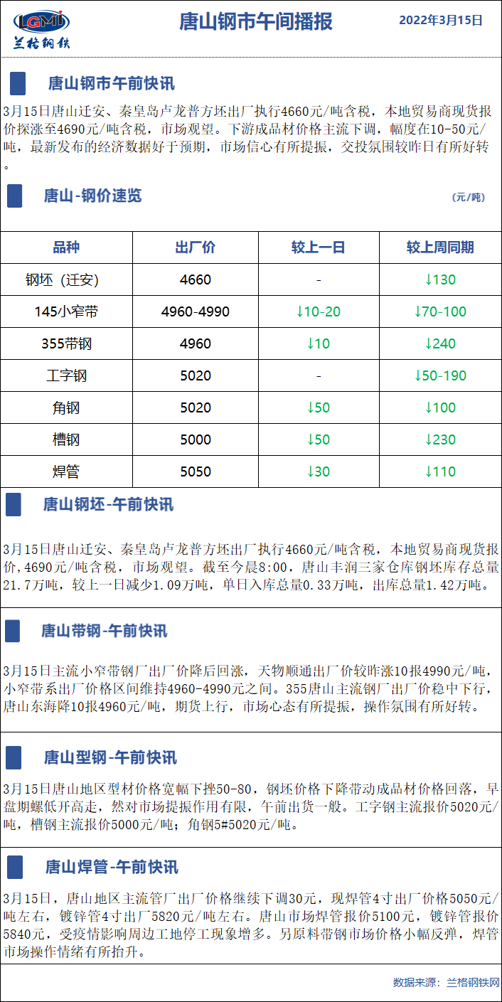 3月15日蘭格唐山鋼市午間播報(bào)