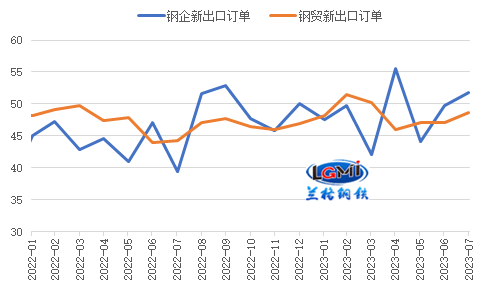 從出口訂單來看,由于海外制造業(yè)持續(xù)在收縮區(qū)間運(yùn)行,外需有減弱趨勢(shì),但在我國(guó)鋼材出口價(jià)格優(yōu)勢(shì)帶動(dòng)下,我國(guó)鋼鐵企業(yè)出口訂單指數(shù)有所改善;中物聯(lián)鋼鐵物流委員會(huì)調(diào)查的2023年7月份鋼鐵企業(yè)新出口訂單指數(shù)回升2.1個(gè)百分點(diǎn),至51.8%(詳見圖3),再次回升至擴(kuò)張區(qū)間;同時(shí)蘭格鋼鐵網(wǎng)調(diào)研的鋼鐵流通企業(yè)新出口訂單指數(shù)回升1.6個(gè)百分點(diǎn),至48.6%。鋼鐵企業(yè)出口訂單指數(shù)回升,將對(duì)后期我國(guó)鋼材出口形成一定支撐。