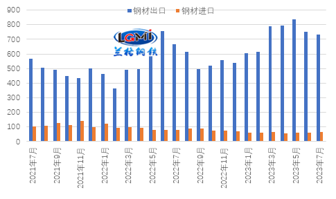 進(jìn)口方面,7月份進(jìn)口鋼材環(huán)比有所回升,較6月份增加6.8萬噸,環(huán)比上升11.1%。