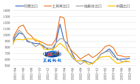8月份以來,海外熱卷出口價(jià)格微升,中國(guó)熱卷出口價(jià)格小幅下滑,我國(guó)鋼材出口報(bào)價(jià)優(yōu)勢(shì)相比7月底有所提升。蘭格鋼鐵研究中心監(jiān)測(cè)數(shù)據(jù)顯示,截至2023年8月7日,印度、土耳其、獨(dú)聯(lián)體熱軋卷板出口報(bào)價(jià)(FOB)分別為620美元/噸、650美元/噸和565美元/噸,中國(guó)熱軋卷板出口報(bào)價(jià)(FOB)為565美元/噸(詳見圖2);目前我國(guó)熱卷出口報(bào)價(jià)較印度、土耳其出口報(bào)價(jià)分別低55美元/噸、85美元/噸;與獨(dú)聯(lián)體熱卷出口報(bào)價(jià)持平。