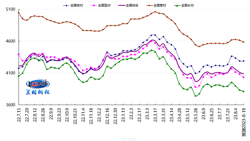 2023年第32周(2023.8.7-8.11)蘭格鋼鐵全國價(jià)格指數(shù)為4108元,較上周下降1.2%,較去年同期下降6.6%。其中,蘭格鋼鐵長材價(jià)格指數(shù)為3834元,較上周下降1.6%,較去年同期下降11.3%;蘭格鋼鐵型材價(jià)格指數(shù)為4081元,較上周下降0.8%,較去年同期下降6.9%;蘭格鋼鐵板材價(jià)格指數(shù)為4287元,較上周下降1.0%,較去年同期下降1.9%;蘭格鋼鐵價(jià)格指數(shù)為4612元,較上周下降0.3%,較去年同期下降7.7%。