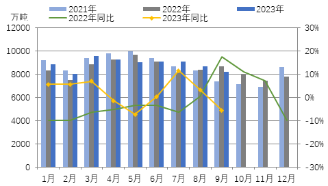 9月份,受到政策組合拳落地見效的原料成本支撐的強(qiáng)推升、旺季需求不足的弱現(xiàn)實等因素的共同影響,鋼廠產(chǎn)能的釋放力度有所下降。據(jù)國家統(tǒng)計局?jǐn)?shù)據(jù)顯示,2023年9月份,生鐵產(chǎn)量7154萬噸,同比下降3.3%;粗鋼產(chǎn)量8211萬噸,同比下降5.6%;均由上月的增長轉(zhuǎn)為下降(詳見圖2);鋼材產(chǎn)量11782萬噸,同比增長5.5%,同比增速較上月收窄5.9個百分點。