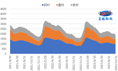 2023年10月份,鋼材社會庫存在國慶節(jié)后短暫回升后,呈現(xiàn)持續(xù)下降態(tài)勢。據(jù)蘭格鋼鐵網(wǎng)監(jiān)測數(shù)據(jù)顯示,截至10月底,蘭格鋼鐵網(wǎng)統(tǒng)計的29個城市鋼材社會庫存為938.9噸,月環(huán)比下降4.8%,年同比上升1.3%。其中,建材社會庫存為440.8萬噸,月環(huán)比下降10.7%,年同比下降2.7%;板材社會庫存為498.0萬噸,月環(huán)比上升1.2%,年同比上升5.0%(詳見圖3)。