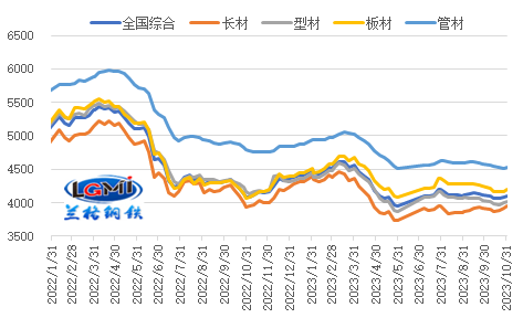 據(jù)蘭格鋼鐵網(wǎng)監(jiān)測數(shù)據(jù)顯示,截至10月底,蘭格鋼鐵全國鋼材綜合價格為4106元/噸,較上月末下跌9元/噸,環(huán)比跌幅為0.2%,年同比上漲0.7%。其中,長材價格為3949元/噸,較上月末上漲39元/噸,環(huán)比漲幅1.0%,年同比上漲0.3%;板材價格為4194元/噸,較上月末下跌45元/噸,環(huán)比跌幅1.1%,年同比上漲3.1%;型材價格指數(shù)為4023元/噸,較上月末下跌14元/噸,環(huán)比跌幅為0.4%,年同比下跌3.3%;管材價格為4523元/噸,較上月末下跌59元/噸,環(huán)比跌幅為1.3%,年同比下跌5.7%(詳見圖1)。