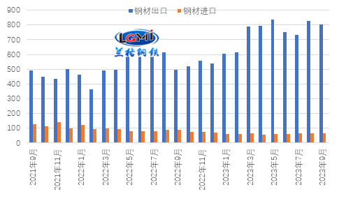 在價格優(yōu)勢及前期訂單回升影響下,9月份我國鋼材出口雖環(huán)比小幅回落、但同比大幅增長。海關(guān)總署統(tǒng)計數(shù)據(jù)顯示,2023年9月份,我國出口鋼材806.3萬噸,同比增長61.9%(詳見圖4);1-9月,我國出口鋼材6681.8萬噸,同比增長31.8%。進(jìn)口方面,9月份,我國進(jìn)口鋼材64.0萬噸,同比下降28.2%;1-9月,我國進(jìn)口鋼材569.8萬噸,同比下降31.7%。