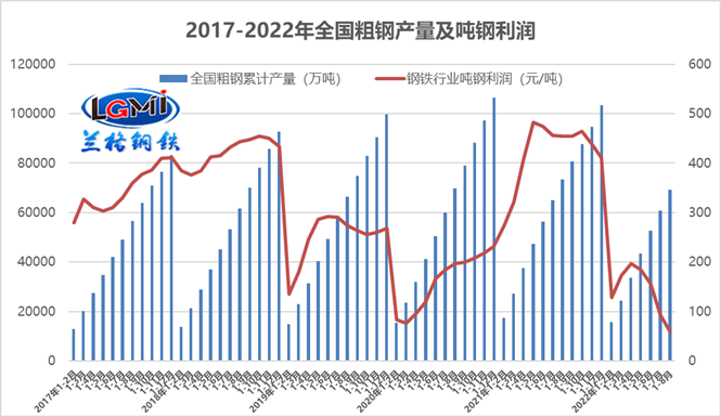 圖1 2017-2022年全國粗鋼產(chǎn)量及噸鋼利潤