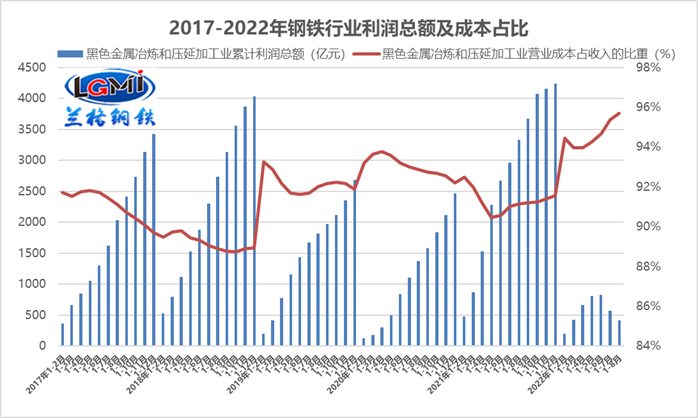 圖2 2017-2022年鋼鐵行業(yè)利潤總額及成本占比