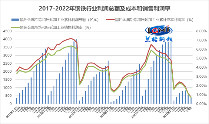 圖3 2017-2022年鋼鐵行業(yè)利潤總額及成本和銷售利潤率